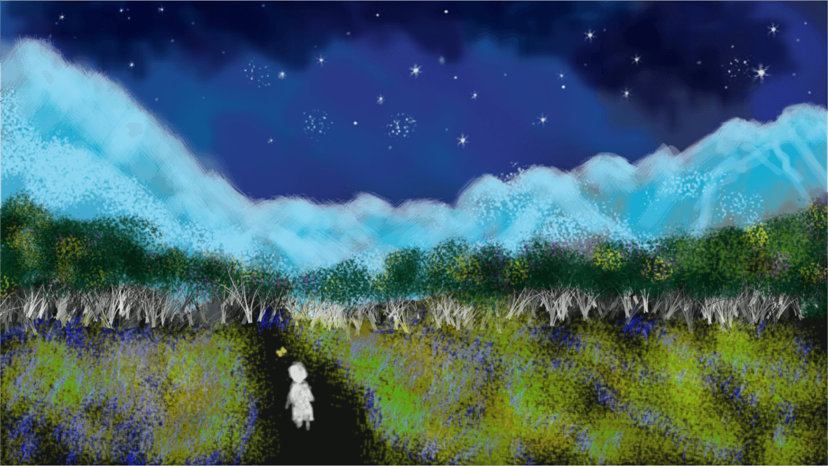 In a sunlit garden, a grandmother and her curious granddaughter spent their days tending to flowers. One day, the little girl asked, "Grandma, why are my eyes so big? "Her grandmother replied with a smile, "When your mother was expecting you, she ate too many blueberries, making your eyes big and round, just like the color of the sky." The granddaughter giggled and asked about a butterfly fluttering by. "This butterfly's color is my favorite," her grandmother said. "And what's yours?" the grandmother asked. The girl proudly showed her yellow handkerchief, pinned to her shirt. Five years later, after her grandmother passed away, the granddaughter returned to the old house. The garden, once vibrant, was now dried out. Feeling lost, she laid down in her grandmother’s room and drifted into a vivid dream. In it, the same butterfly appeared, glowing softly in the darkness. She followed it through a portal into a world filled with glowing flowers and Sakura trees. There, she saw her grandmother, lovingly tending the garden. Just as she reached out to her, the dream faded, and she awoke, inspired. Determined to revive the neglected garden, the granddaughter began to tend to it with care, bringing life back to the place where they had shared so many cherished moments. As the flowers bloomed once more, she felt her grandmother’s love surrounding her, like the glowing butterfly in her dream.