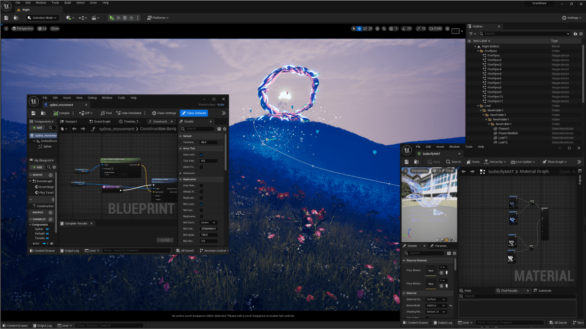 To create the firefly effect, I used the Niagara particle system in Unreal Engine. I designed a GPU sprite-based emitter to simulate the glowing movement of fireflies. By controlling the spawn rate and particle size, I achieved a natural density and scale. I added a glow material with emissive properties to mimic the luminescence of real fireflies. Finally, I implemented randomized movement and flickering light intensity to make the fireflies appear dynamic and lifelike, creating an enchanting night scene.